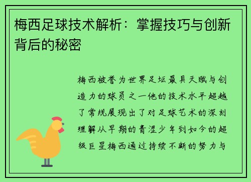 梅西的足球技术是一种天赋与努力相结合的结果,他的控球、盘带、传球和射门都展现了他对足球艺术的深刻理解。梅西的每一项技术背后,都有着他长期的训练与不断的创新。他不仅在场上是一位伟大的球员,更是一位艺术家,能够用足球这项运动创造出无数令人赞叹的瞬间。